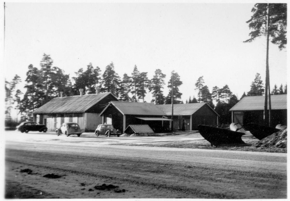 Vägstation C4, Björklinge. Garagebyggnad invid väg. Personbilar framför garaget. Spetsplogar.