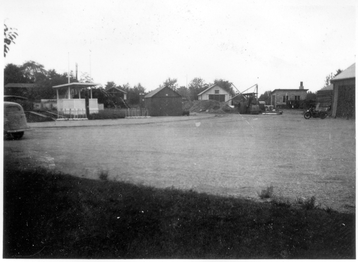 Vägstation O7, Tanumshede. Vägstationens garageplan med olika förrådsbyggnader och Munktell motorvält, motorcykel, personbil.
