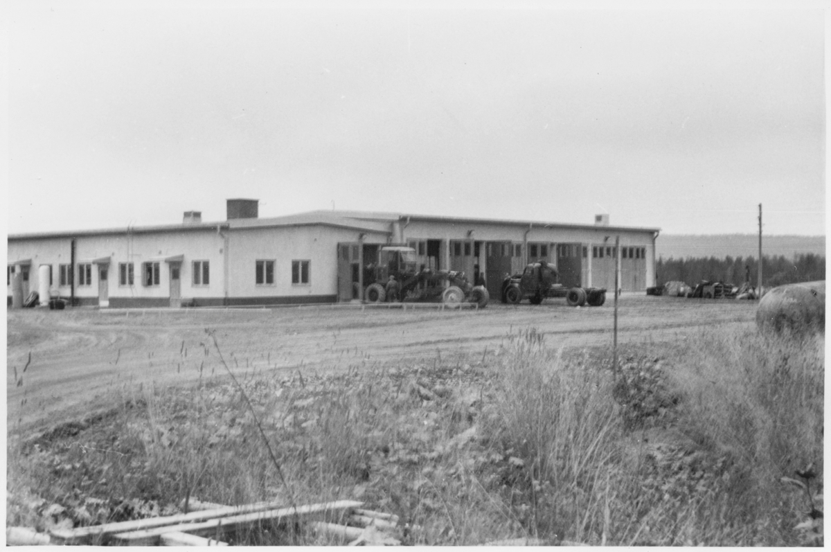 Depåverkstad VFAC (Vmo AC4, Vännäs). Depåverkstad (länsverkstad). Kontor och förrådsbyggnad till vänster. Verkstad till höger. Framför verkstaden väghyvel och lastbil.