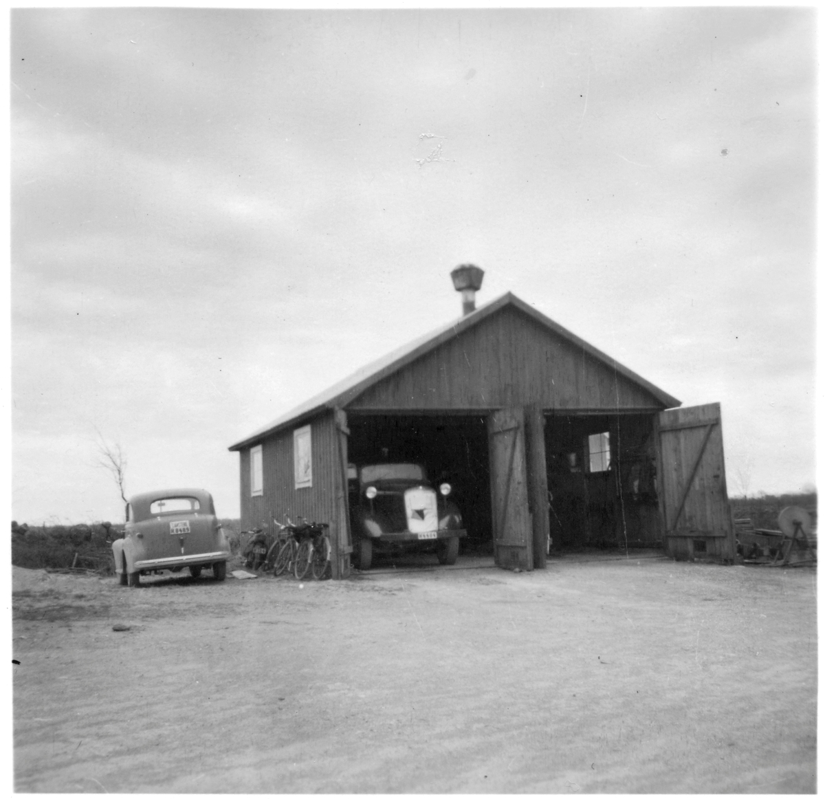 Vägstation H12, Bengtstorp, filial Björnhovda. Garagebyggnad, portar på gaveln. Öppna. En lastbil i garaget. Vid sidan personbil märkt "Tjänstebil" H 8489. Cyklar och en motorcykel lutade mot garageväggen.