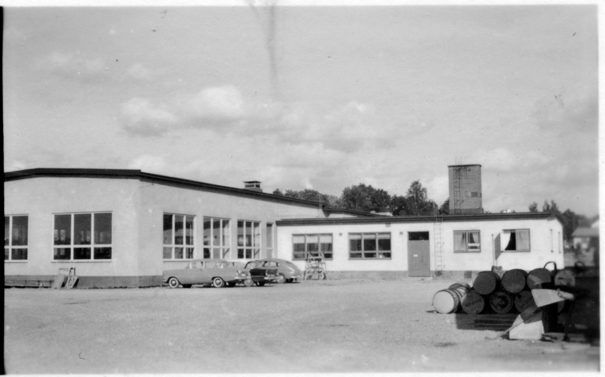 Vägstation D5, Flen. Verkstadsbyggnad och kontorsbyggnad. Personbilar parkerade framför verkstadsbyggnaden. Upplag av bränslefat.