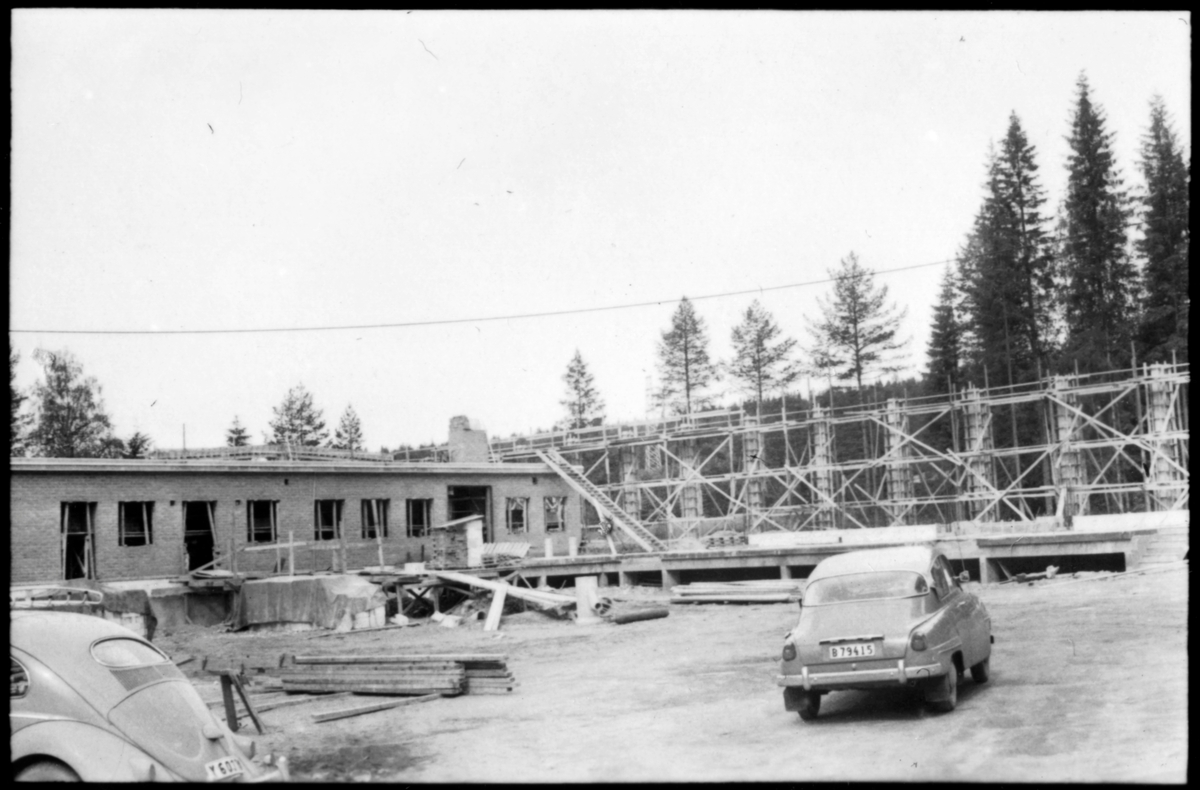 Vägstation Y1, Ånge. Byggande av ny vägstation. Kontors- och förrådsbyggnad. Personbilar i förgrunden, Saab B79415 och Volkswagen.