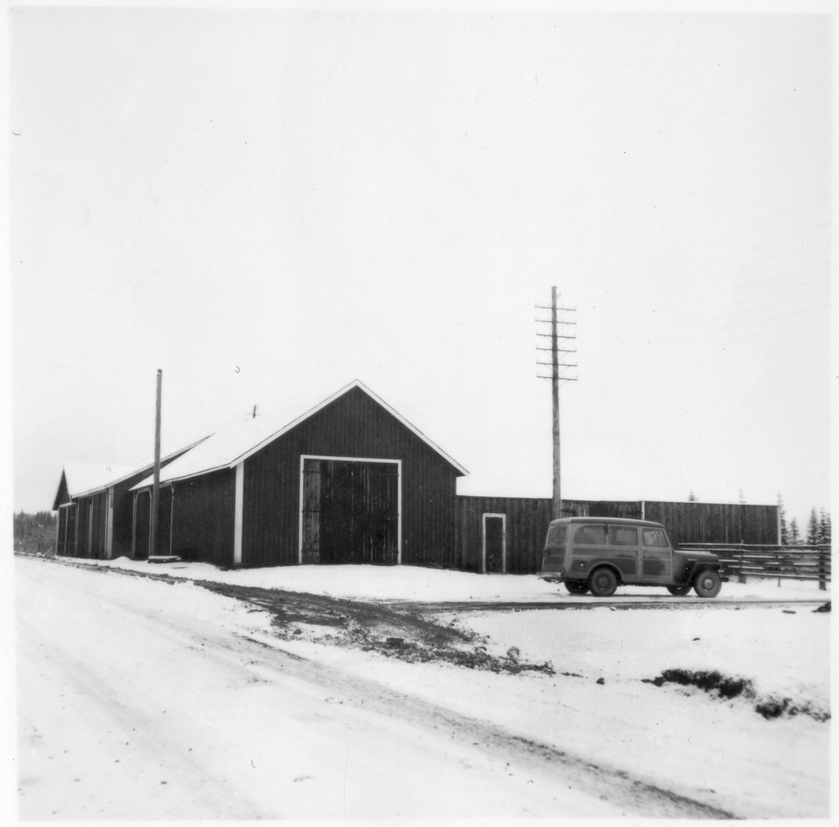 Vägstation BD14, Vittangi, filial Svappavaara. Garage- och förrådsbyggnader. Invid väg med personbil. (Vinterbild).