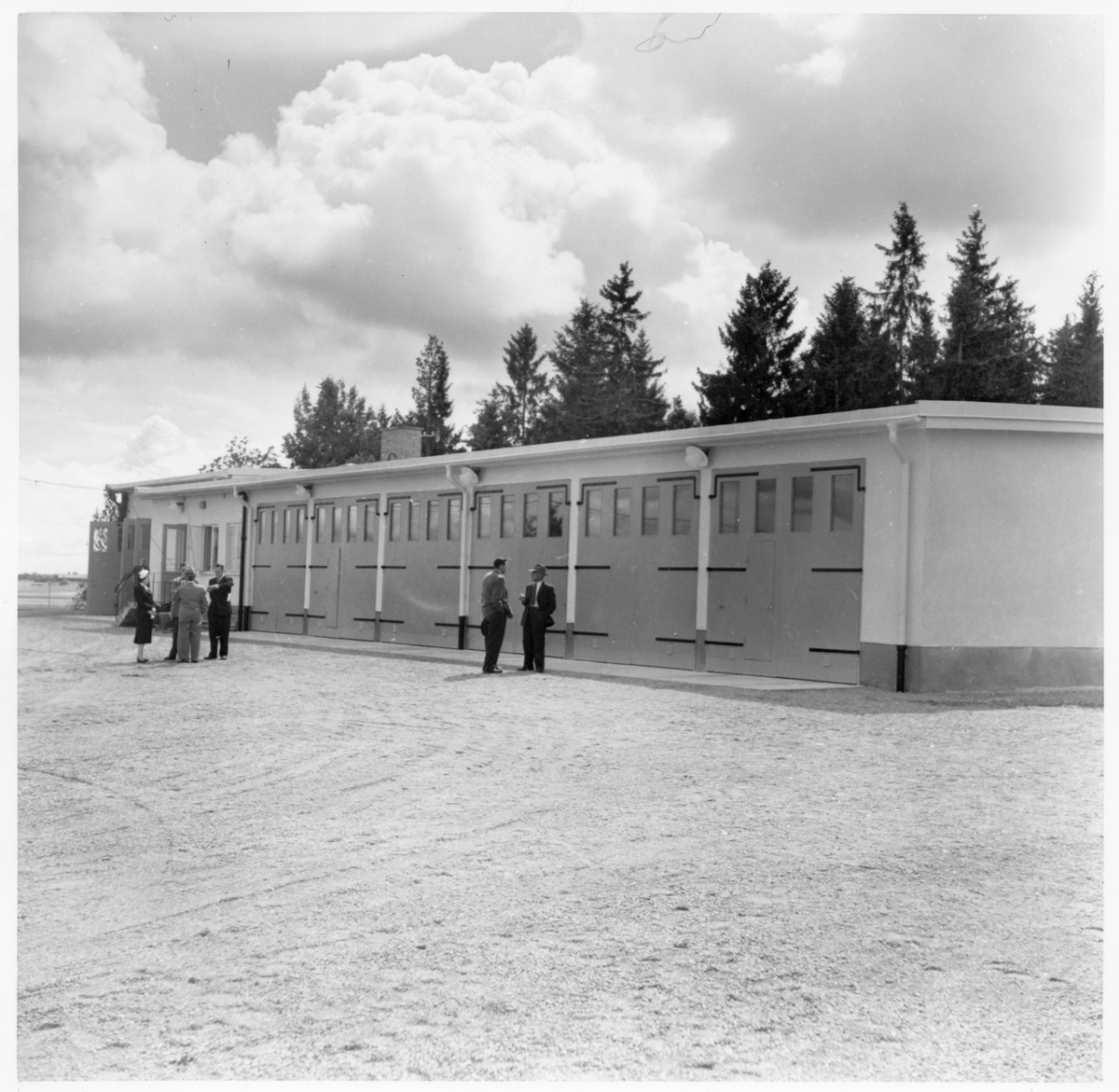 Vägstation U8, Fjärdhundra. Vägstationens huvudbyggnad med från vänster verkstad, kontor och garage. Manspersoner och kvinnoperson på garageplan.