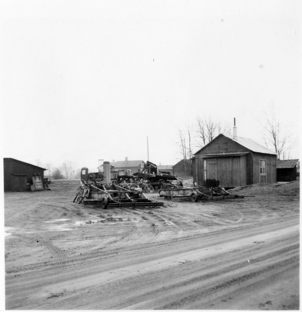 Vägstation BD6, Råneå. Förrådsbyggnad, till vänster. Mot byggnaden upprest sandspridare. Byggnad, eventuellt manskapsbod, till höger. Upplag av olika väghållningsmaskiner, bland annat vägsladdar. Cyklar, bensinpump (drivmedelspump). Bostadshus i bakgrunden. Invid väg.