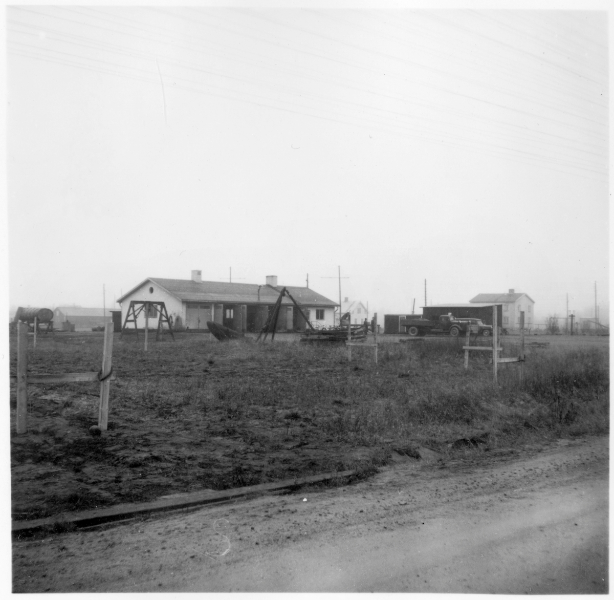 Vägstation BD2, Älvsbyn. Vy mot vägstationen med garage- och kontorsbyggnaden i bakgrunden. Förrådsbyggnad till höger. Luttunna, sidoplog, lastbil personbil framför byggnaderna. Invid väg.