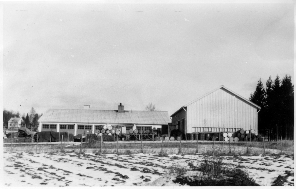 Vägstation D5, Flen. Vy mot garageplan, garagebyggnad i fonden, förrådsbyggnad till höger. Upplag av bränslefat.