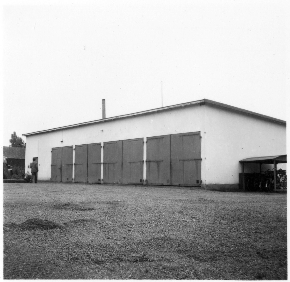 Vägstation E12, Tjällmo. Garagebyggnad, mansperson. Cykelställ med cyklar vid gaveln.
