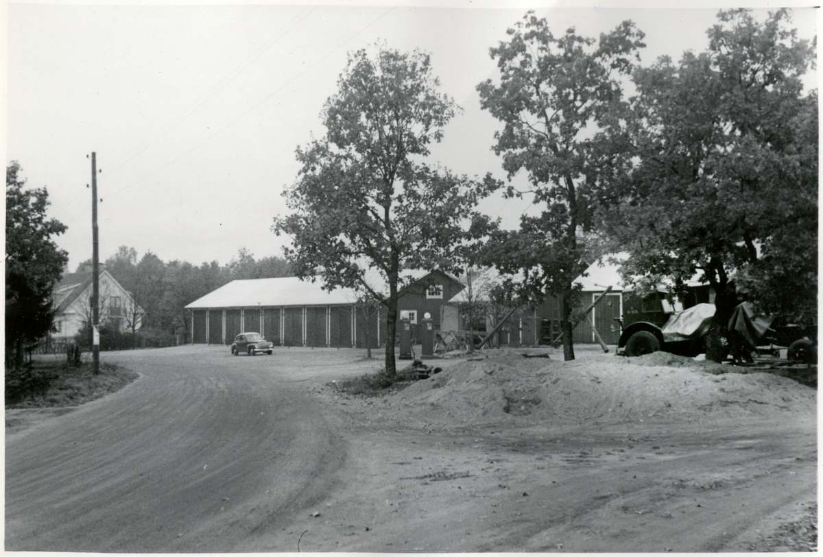 Vägstation N2, Skedala. Garagebyggnad och förrådsbyggnader. Framför garaget personbil Volvo PV. Bensinpumpar (drivmedelspumpar). Väghyvel till höger. Invid väg. Bostadshus bortom garaget.