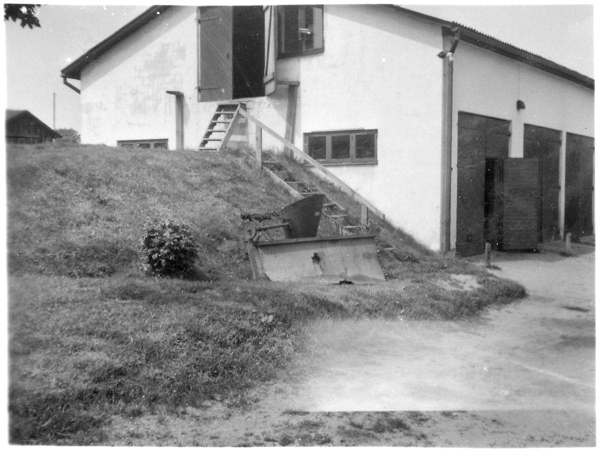 Vägstation P1, Hid. Del av förrådsbyggnad, eventuellt äldre garage. Portar till förråd i vindsvåningen. Sandspridare i förgrunden.