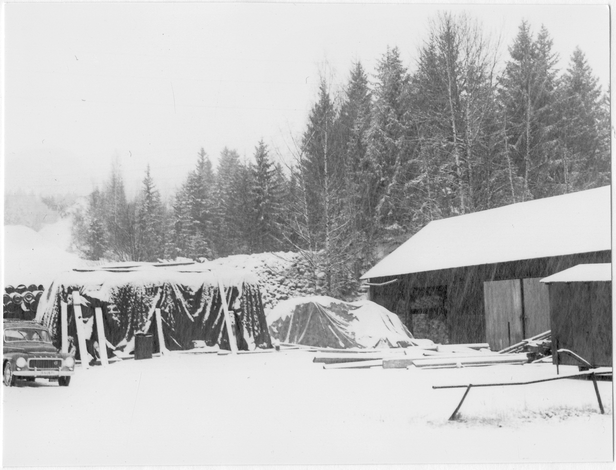 Vägstation S7, filial Toneby. Förrådsbyggnad. Upplag diverse material, personbil Volvo PV. Vinterbild.