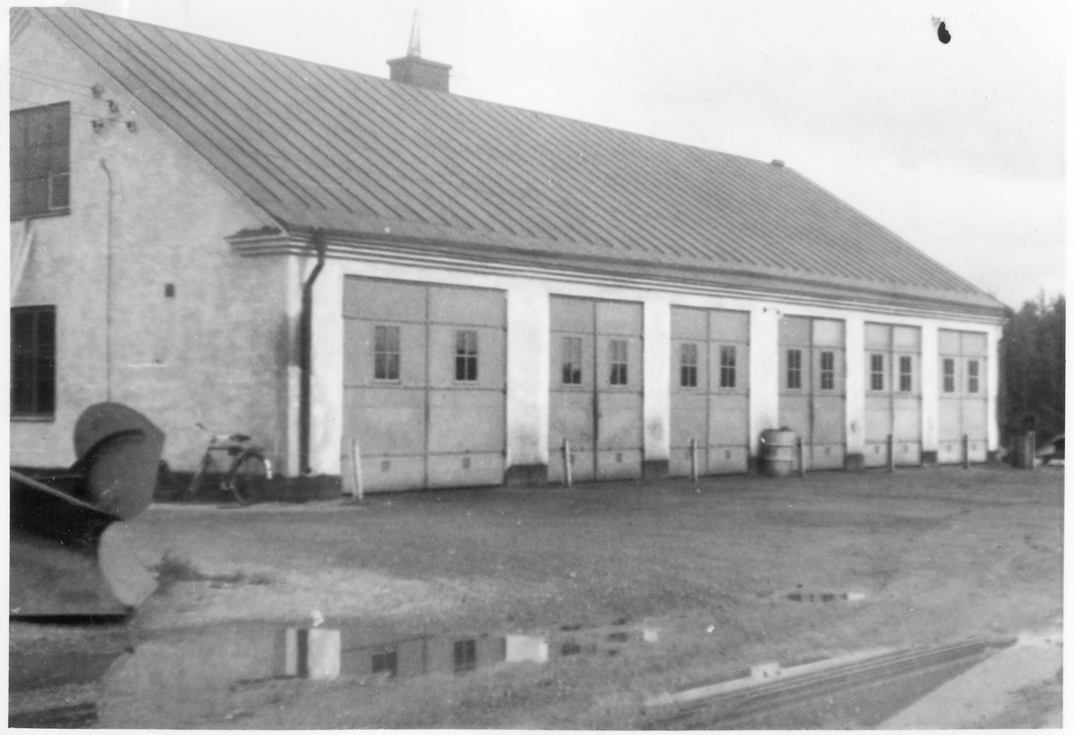Vägstation S3, Filipstad. Garagebyggnad. Vid gavel en spetsplog.