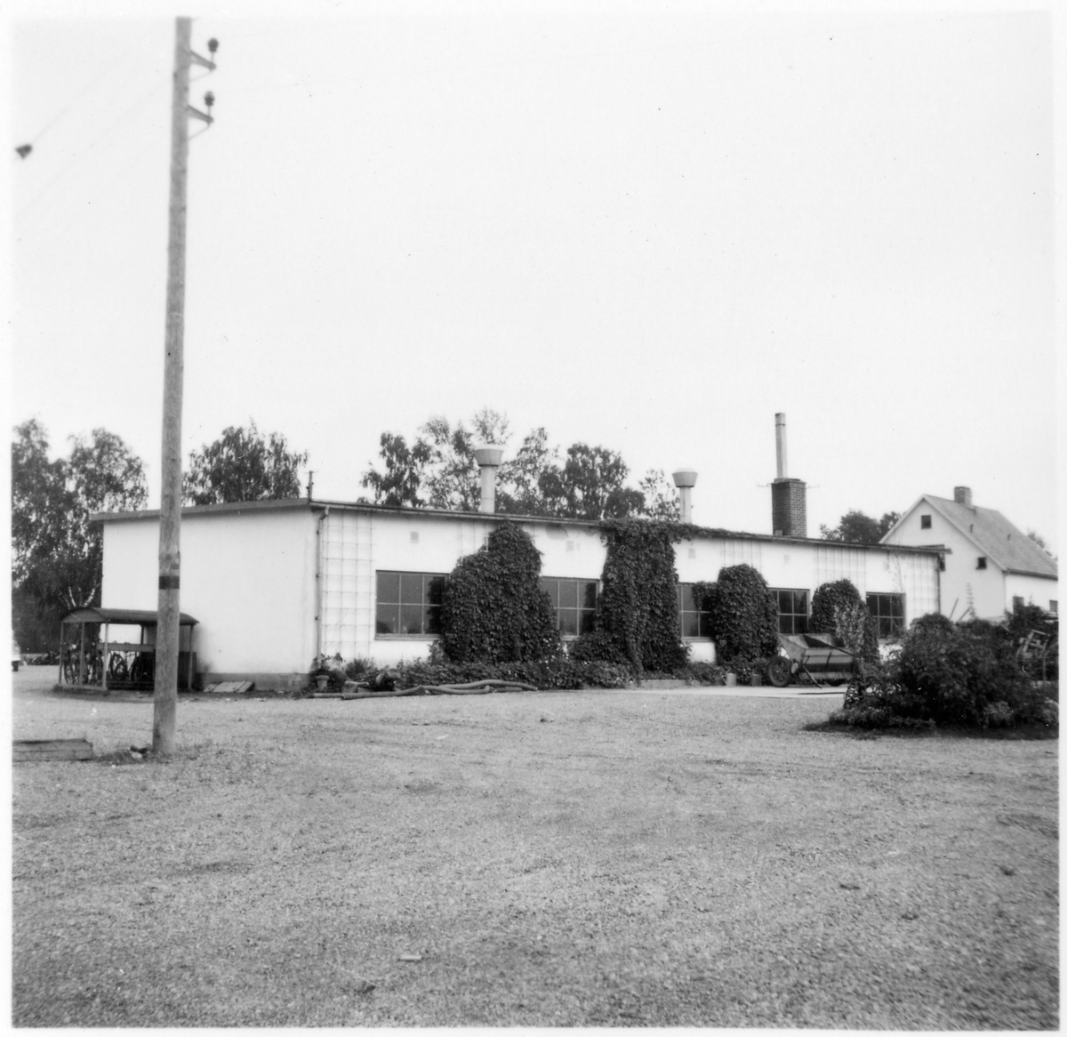 Vägstation E12, Tjällmo. Garagebyggnad, baksidan. Cykelställ med cyklar vid gaveln. Sandspridare. Bostadshus till höger.