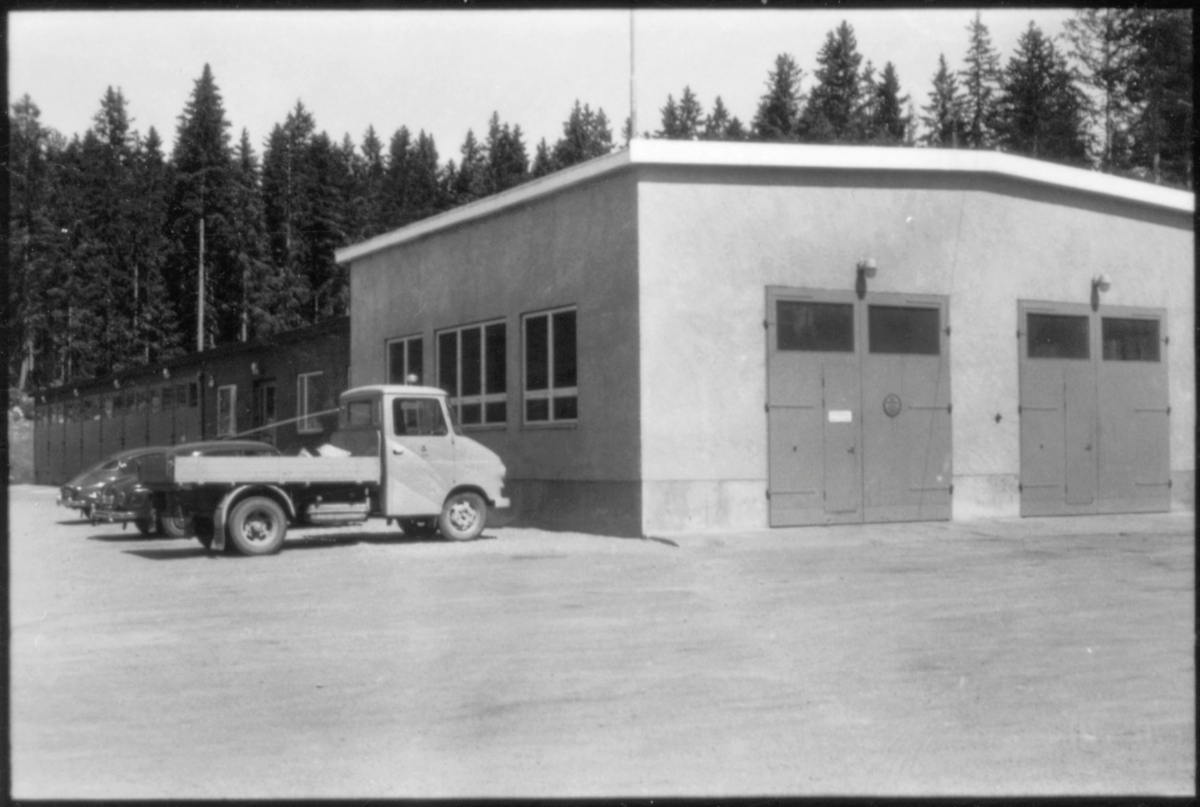 Vägstation Vmo X6, Forsa. Verkstadsbyggnad. Paketbil (liten lastbil) och personbilar. Garagebyggnad i bakgrunden.