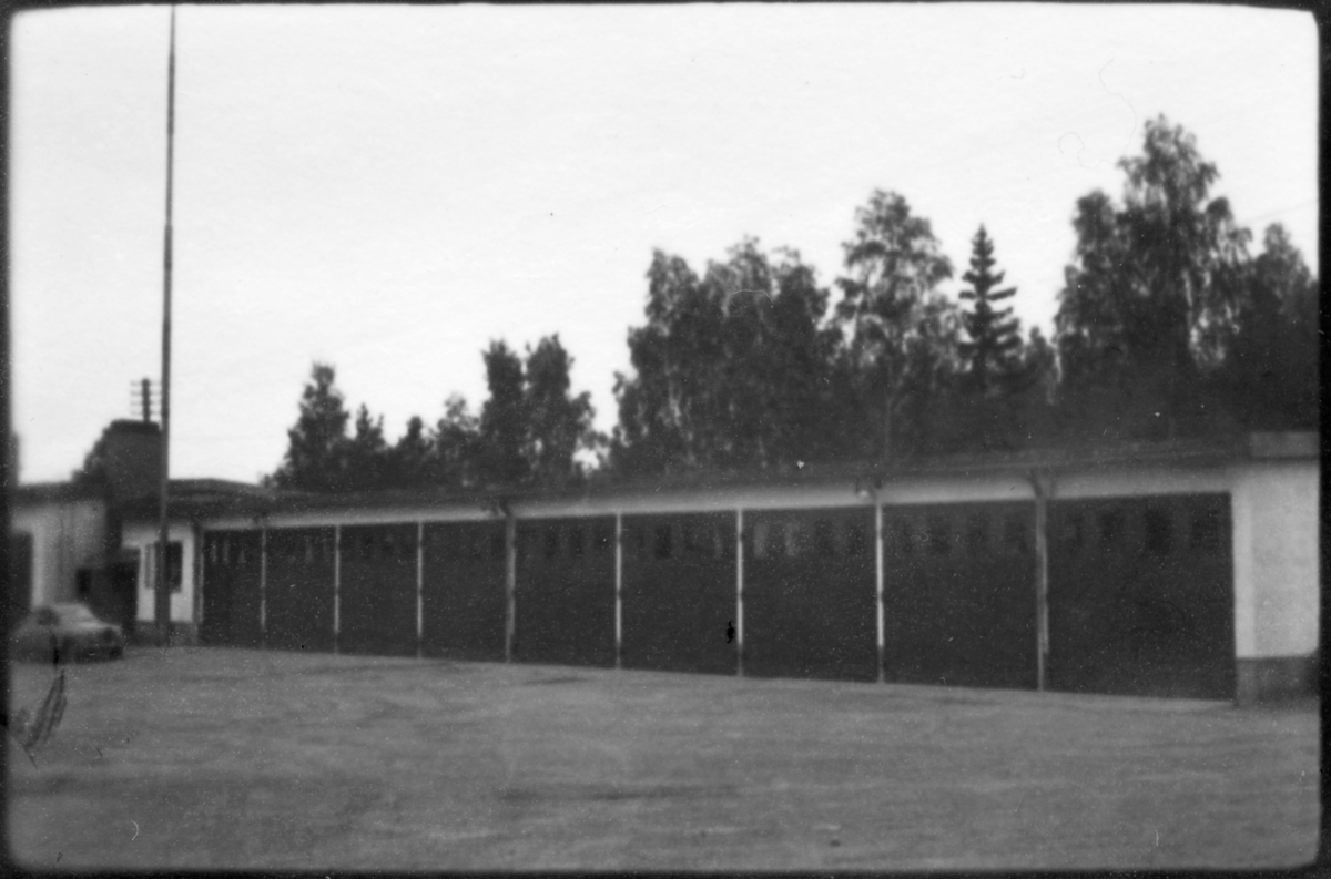 Vägstation H13, Kristdala. Garagebyggnad med kontorsdel längst bort. Personbil Saab framför kontorsdelen. Radiomast.