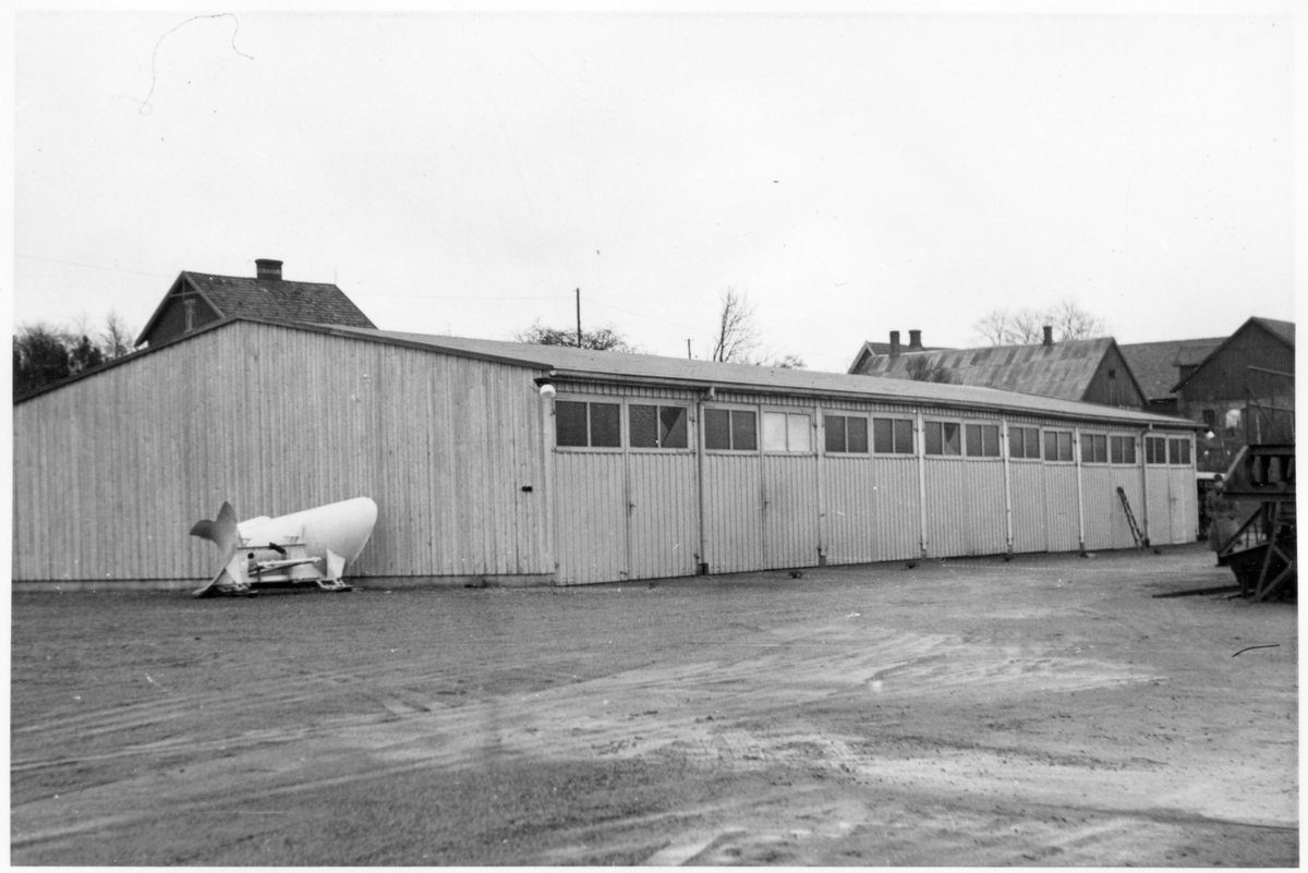 Vägstation L2, Åstorp. Förrådsbyggnad. Vid gaveln vitmålad spetsplog.