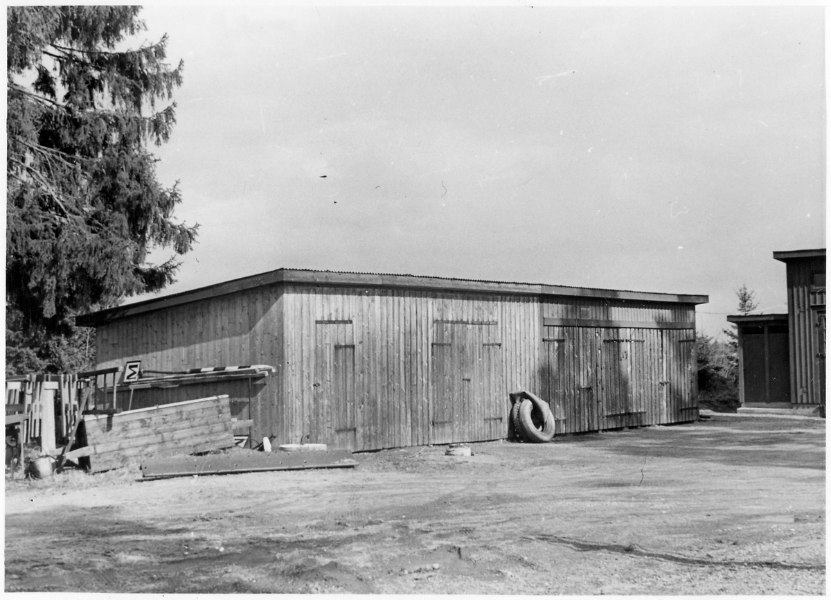 Vägstation T4, Svartå, filial Kvistbro. Förrådsbyggnad. Diverse upplag av material vid gaveln, bland annat vägmärke för mötesplats "M".