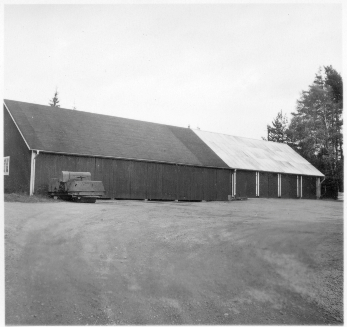 Vägstation C2, Bålsta. Förråds- och garagebyggnad. Framför förrådet en motorvält.