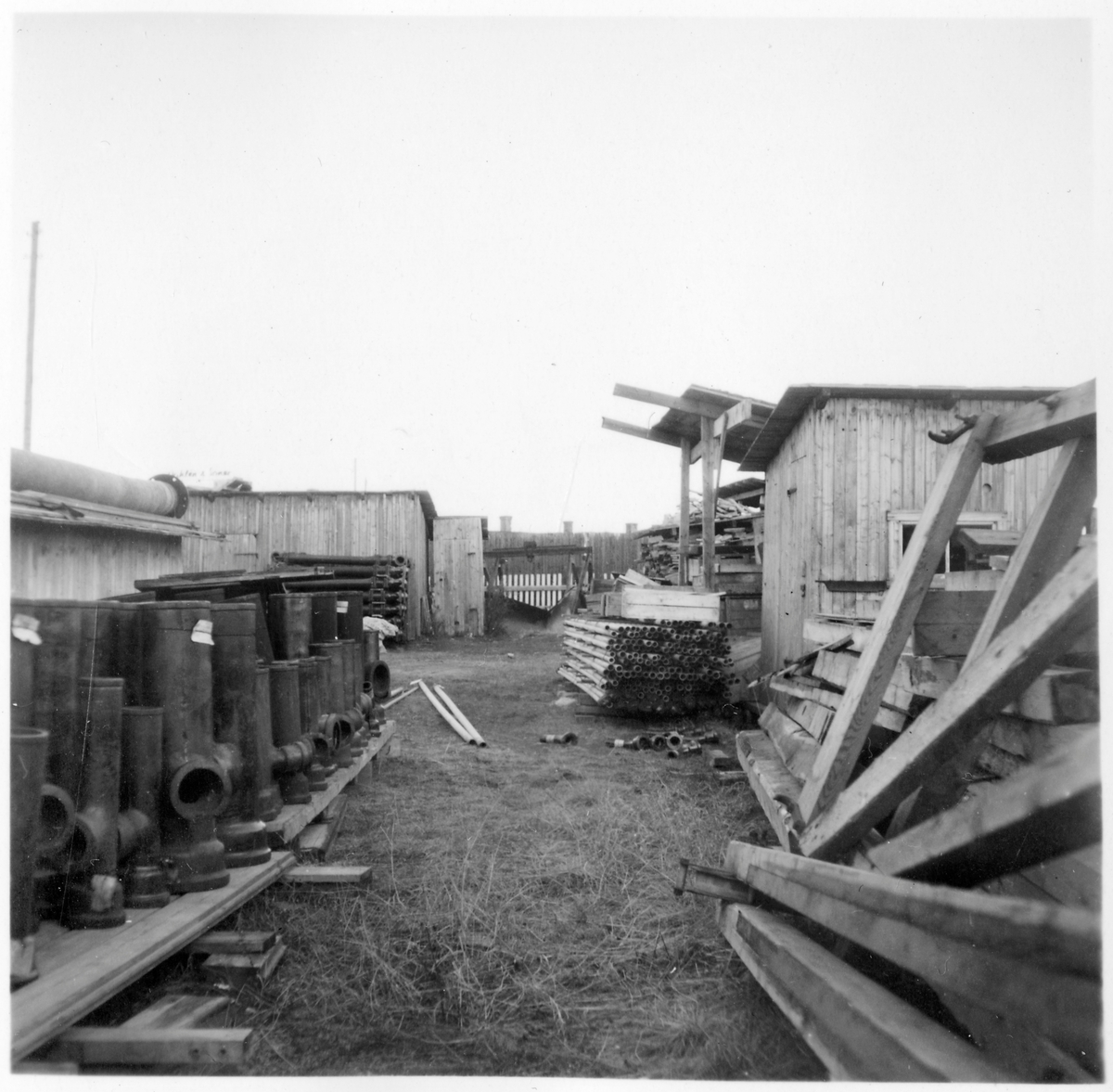 Kvarteret Stören, Luleå. Förrådsbyggnader. Upplag av diverse materiel, bland annat cementrör.