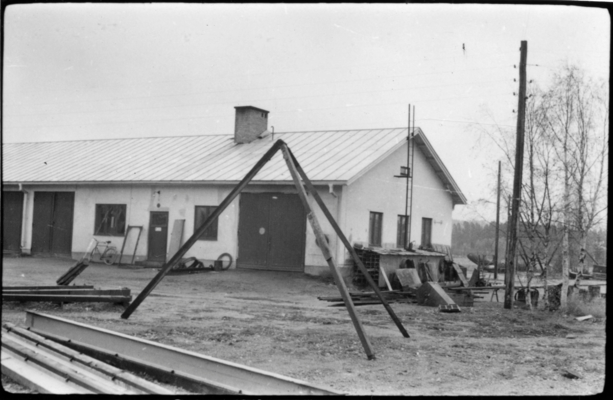 Vägstation AC 16, Åsele. Vägstationens huvudbyggnad med från vänster garage, kontor, verkstad. Verkstadsdelen närmast. Cykel framför verkstaden. Upplag av diverse materiel.