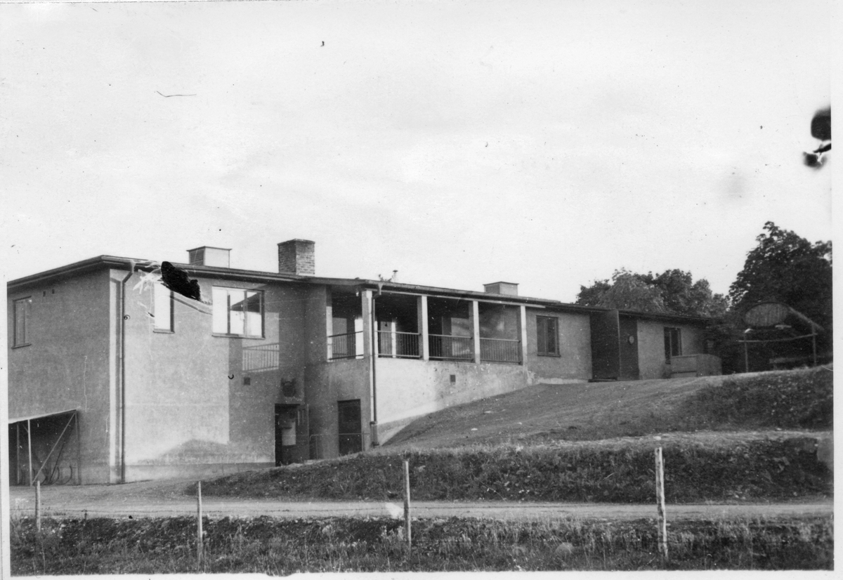 Vägstation R8, Falköping. Baksidan av vägstationens huvudbyggnad, med kontor och förråd. Luttunna till höger.