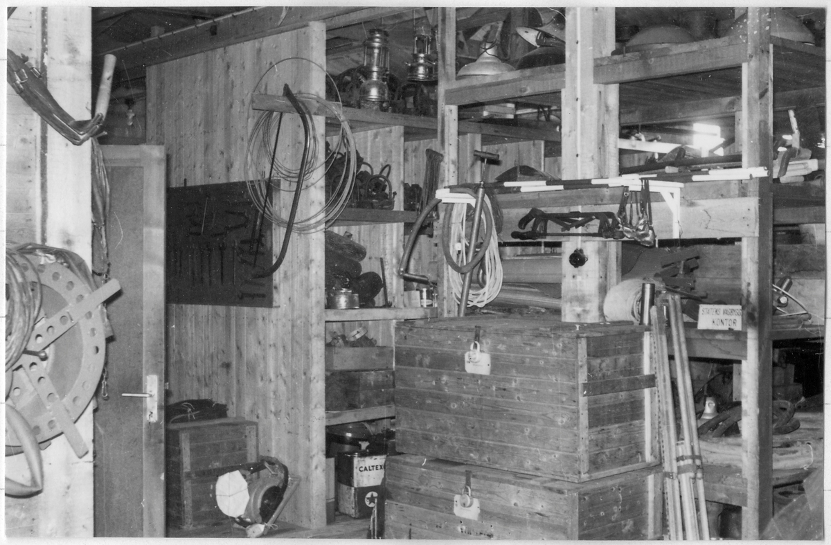 Vägförvaltningen i Västernorrlands län, VFY, Byggnadsförrådet. Interiör från förrådsbyggnad. Hyllsystem med olika redskap, såsom fotogenlampor, skiftnycklar (fasta nycklar), stativ till avvägningsinstrument, avvägningsstång.
