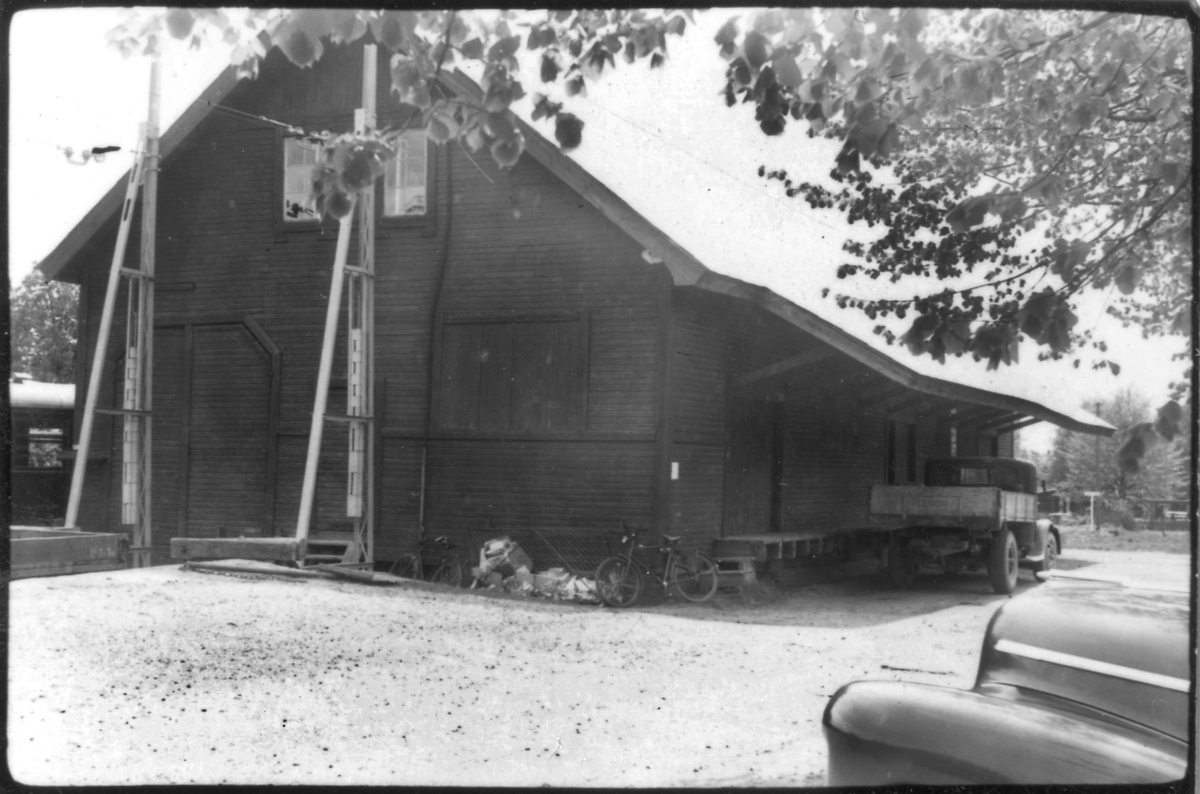 VFS, Depåförrådet. Förrådsbyggnad, godsmagasin med lastbrygga. Invid järnväg, förmodligen järnvägsstation/bangård. Lastbil vid lastbryggan. Okänd ort.