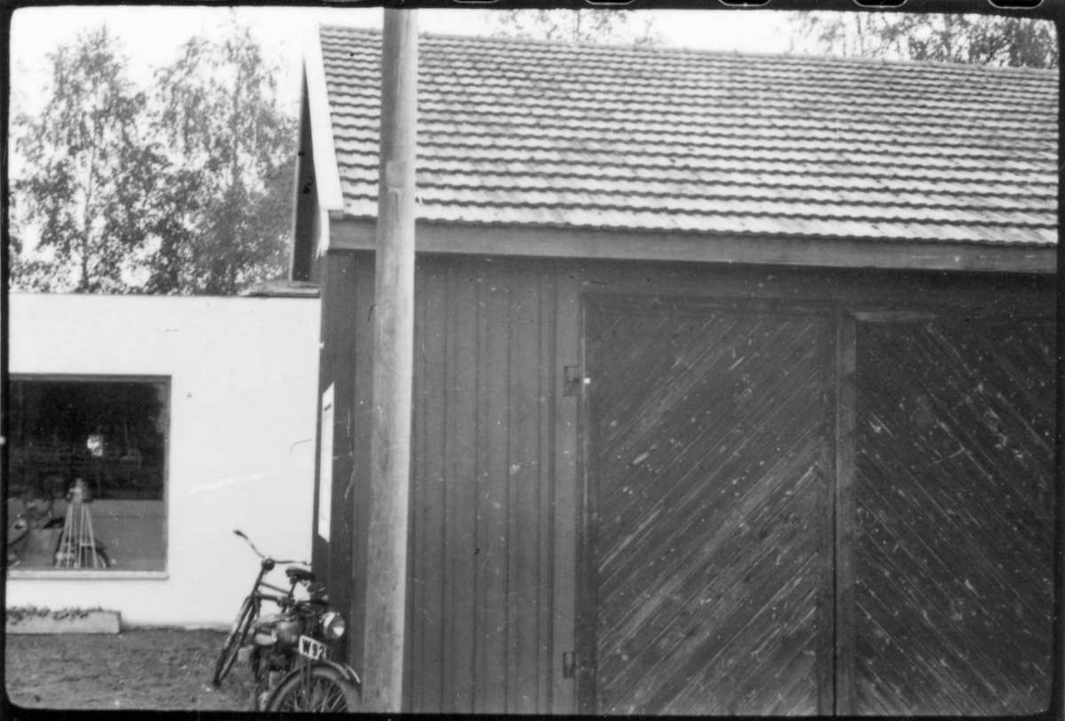 Vägstation W9, Nås, filial Dala-Järna. Garagebyggnad, detalj av ena hörnet. Bensinstations servicebyggnad skymtar i bakgrunden. Vid gavel cyklar och motorcykel W9281.
