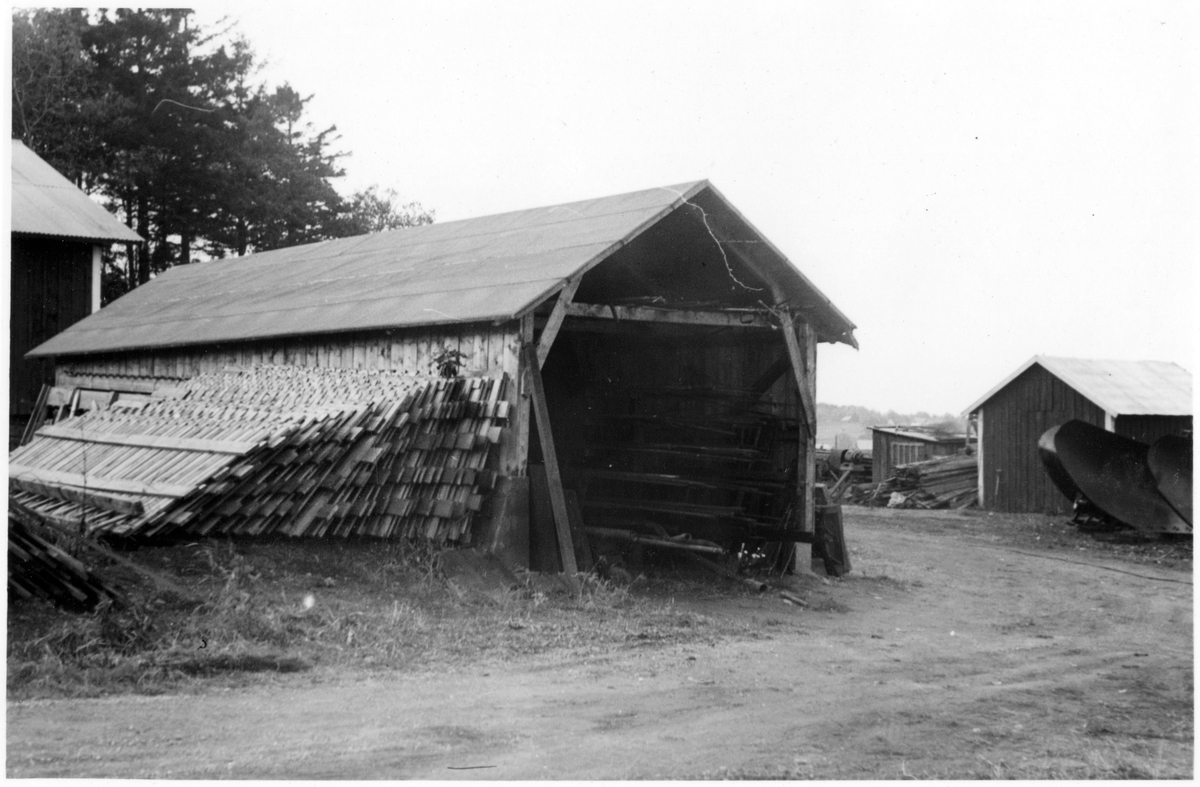 Vägstation N3, Kvibille. Förrådsbyggnader. Snöskärmar lutade mot väggen till förrådsbyggnad med öppen gavel. Upplag av järnrör med mera i den öppna förrådsbyggnaden. Spetsplog till höger.