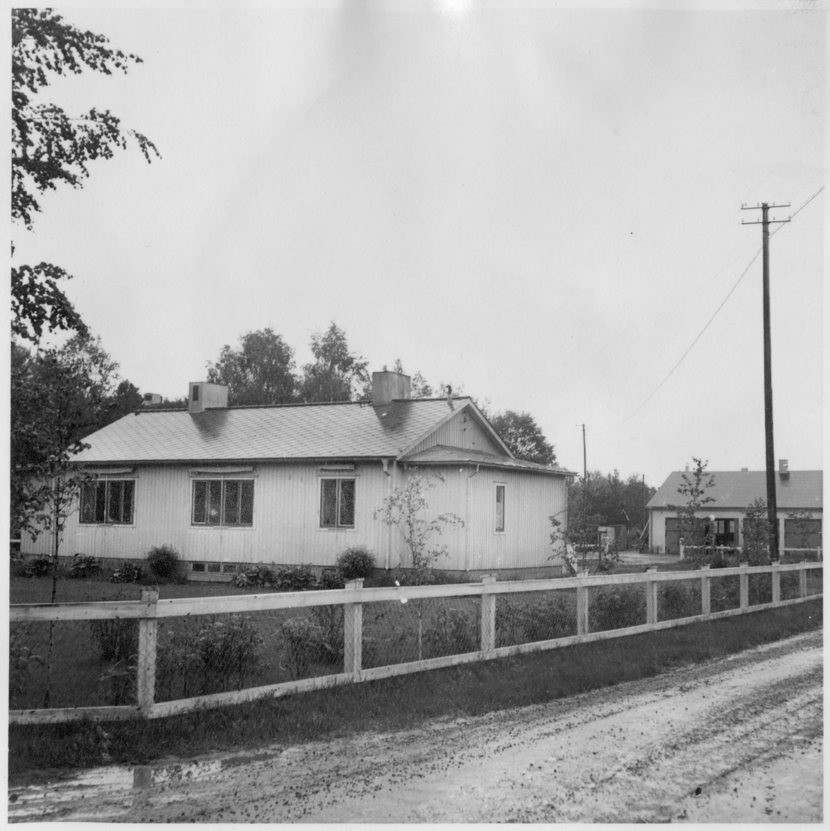 Vägstation BD1, Öjebyn. Bostadshus (baksidan), eventuellt tjänstebostad för vägmästaren samt kontor. Garagebyggnaden i bakgrunden. Lågt trästaket med nät inramar byggnadens trädgård.