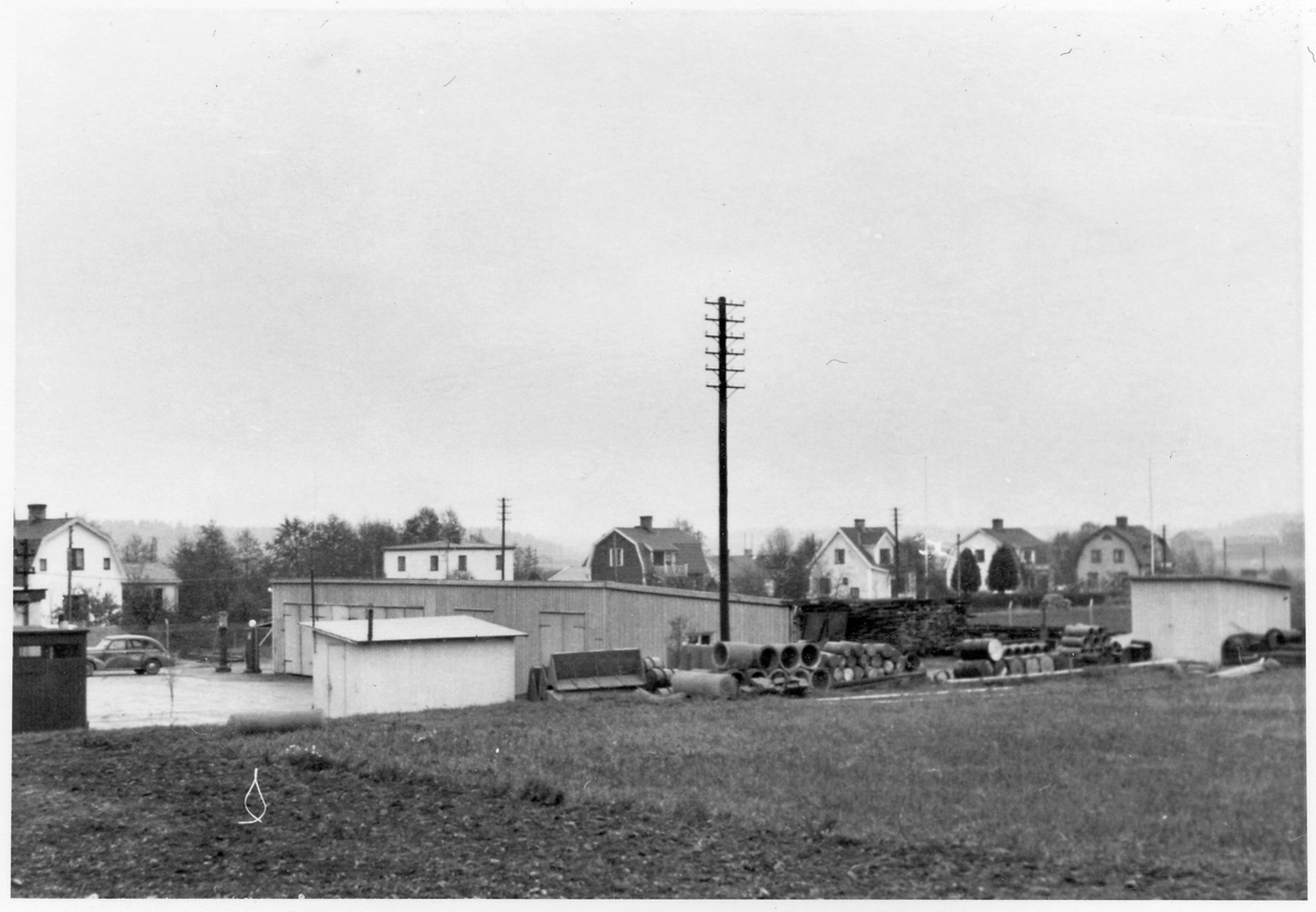 Vägstation B5 Rimbo. Översikt verkstadsbyggnad och förrådsbyggnad. Vid gaveln av verkstadsbyggnaden manskapsvagn ÅSA, Åmåls Sågverks AB. Upplag av cementrör och drivmedelsfat. Bensinpumpar (drivmedelspumpar).