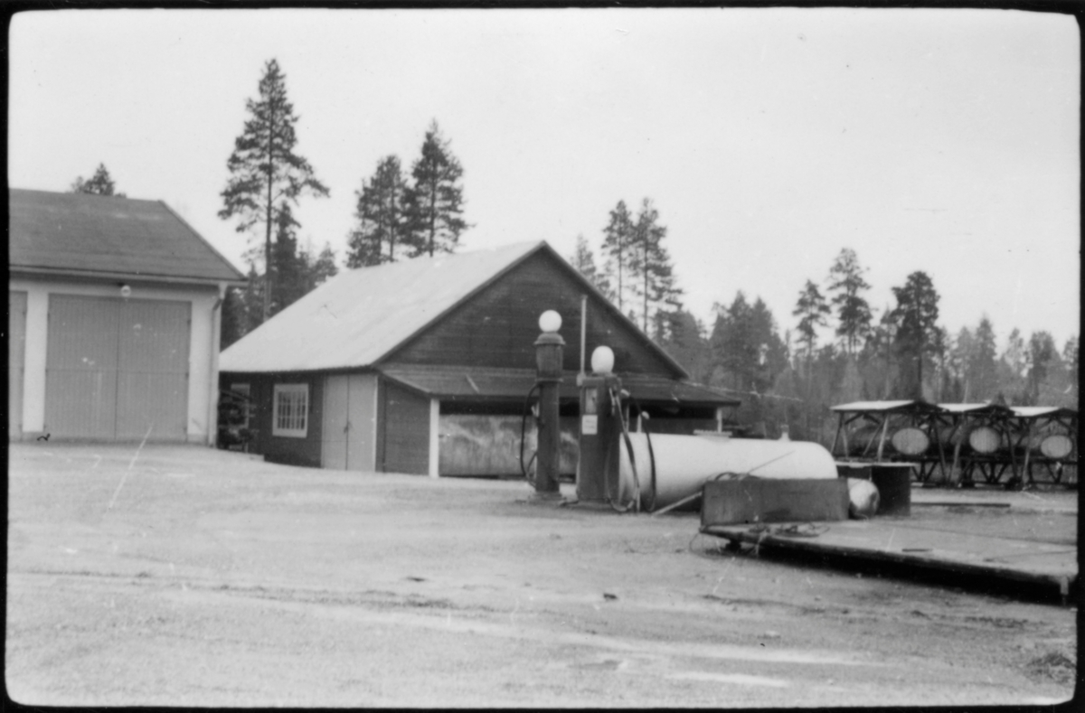 Vägstation AC1, Nordmaling. Förrådsbyggnad, garagebyggnaden skymtar till vänster. Bensinpumpar (drivmedelspumpar) varav en Ljungmans, modell Vici, bränsletank, ("farmartank"). Luttunnor på bockar, under tak.