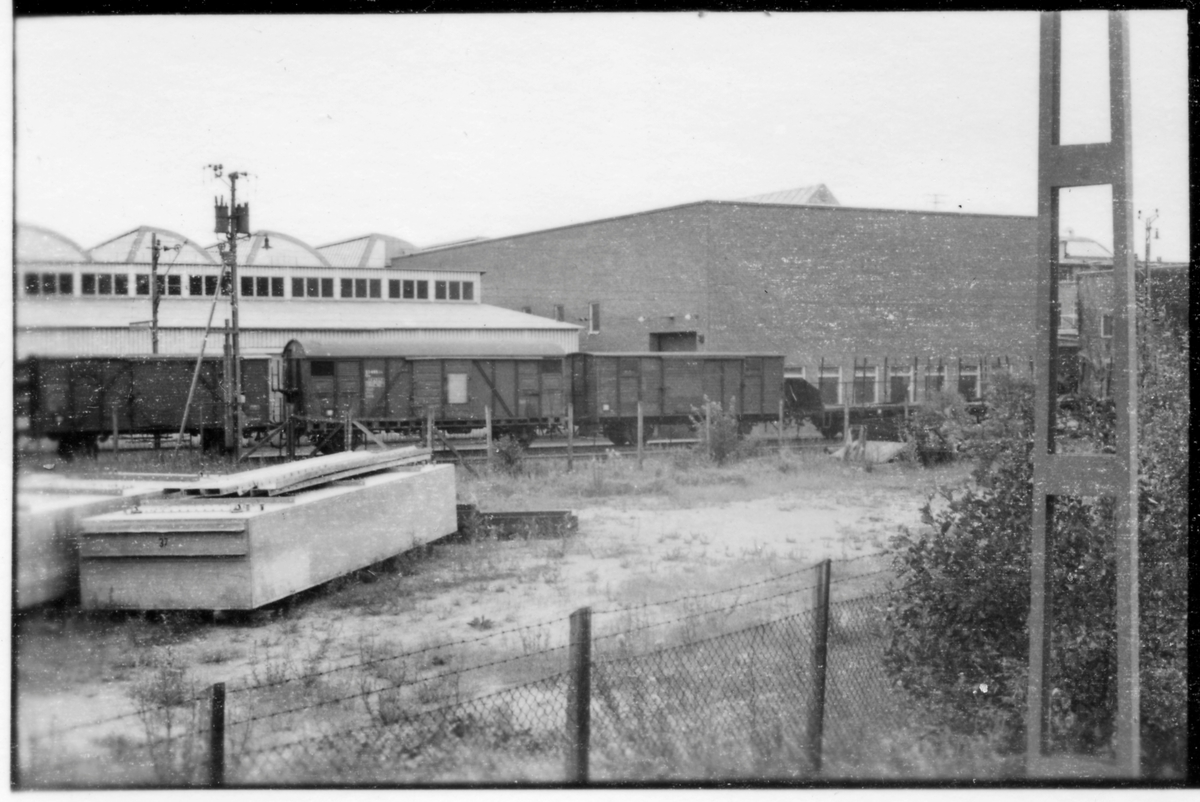 Vägstation B12, Järna. Balkupplaget, Södertälje. Betongbalkar. Järnvägsvagnar, gods, i bakgrunden.