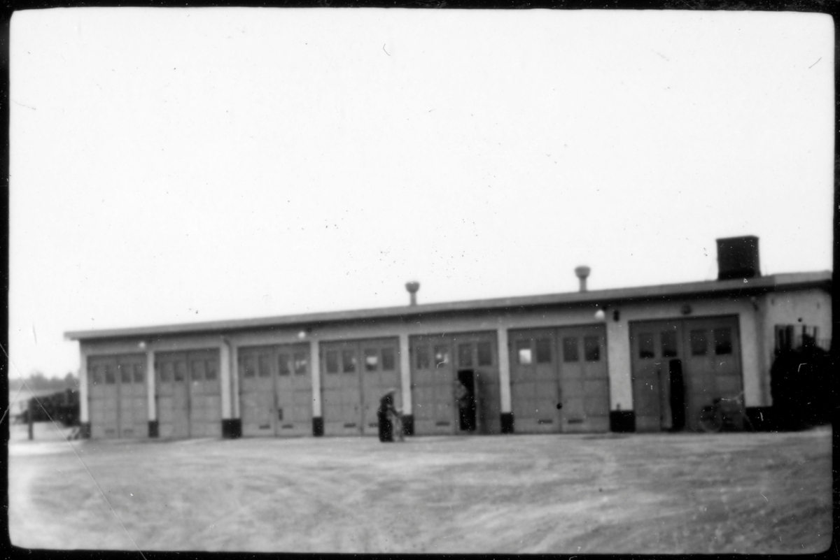Vägstation Vmo E3, Boxholm, filial Ödeshög. Garagebyggnad. Mansperson på garageplan.
