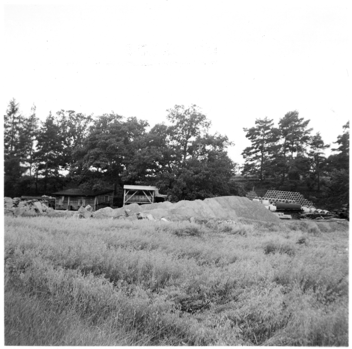 Vägstation E10, Östra Husby, filial, Söderköping. Materielupplag i anslutning till vägstationen. Luttunna, cementrör (muffrör).