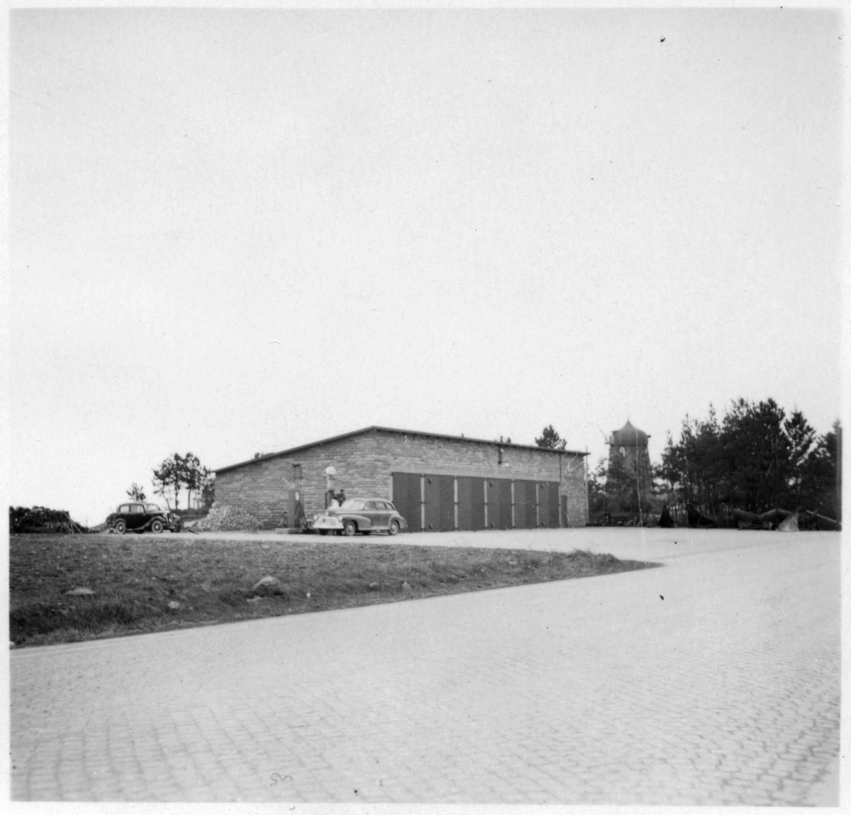 Vägstation H12, Bengtstorp. Garagebyggnad, av tegel. Bensinpumpar (drivmedelspumpar), två personbilar, mansperson. I bakgrunden en väderkvarn. Invid gatstensbelagd väg. Garageuppfarten med gatsten.