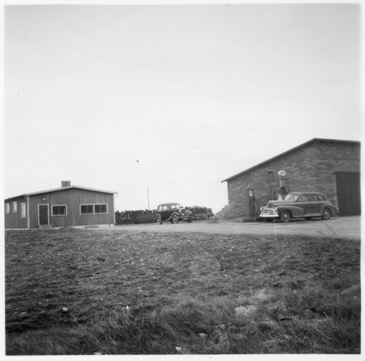 Vägstation H12, Bengtstorp. Kontors- och förrådsbyggnad samt garagebyggnad. Bensinpumpar (drivmedelspumpar), den ena märkt "ESSO". Två personbilar.