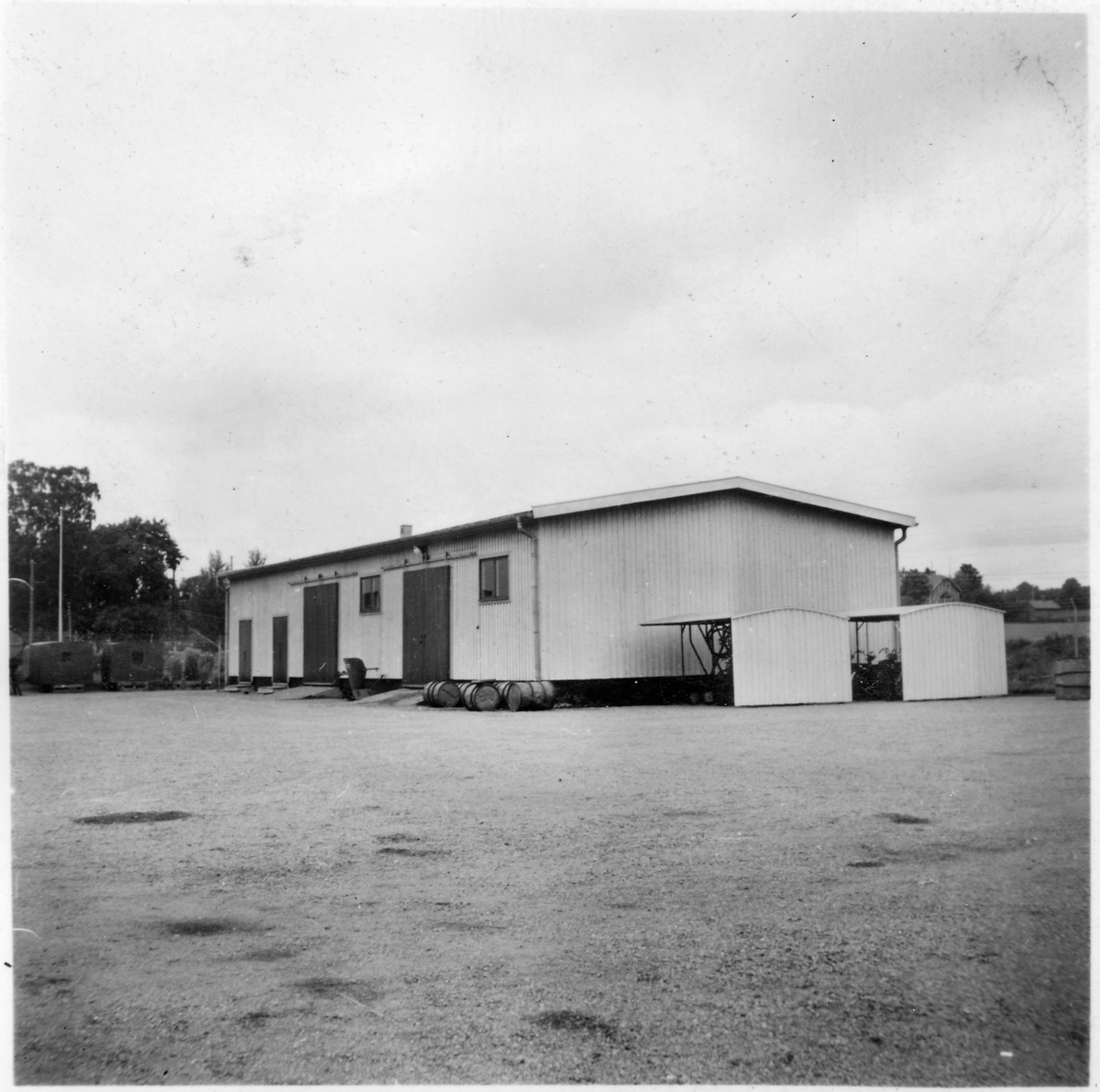 Vägstation K1, Lyckeby. Förrådsbyggnad. Cykelställ med cyklar vid gaveln.