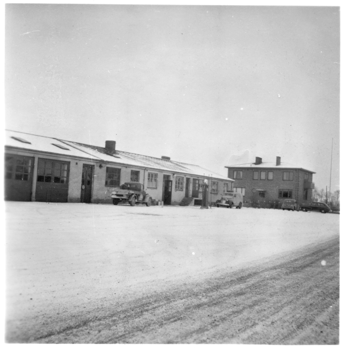 Vägstation M11, Södervidinge. Vägstationens huvudbyggnad med från vänster garage, förråd och kontorsdel. Framför byggnaden liten lastbil, "paketbil" och personbilar. Bostadshus i bakgrunden.