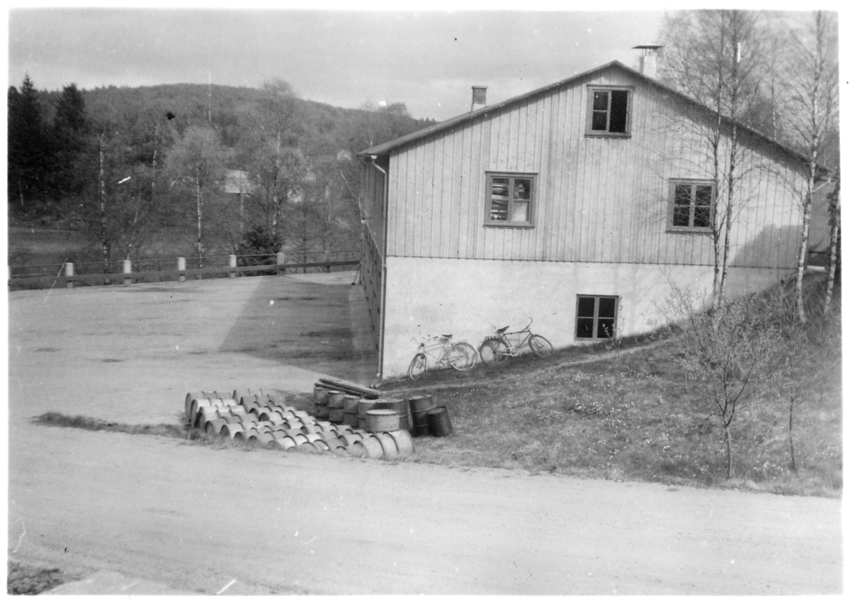 Vägstation N5, Ullared. Stationsbyggnad med garage och kontor i souterrängvåningen, förråd i markplan (ovansidan). Cyklar mot väggen, bränslefat.