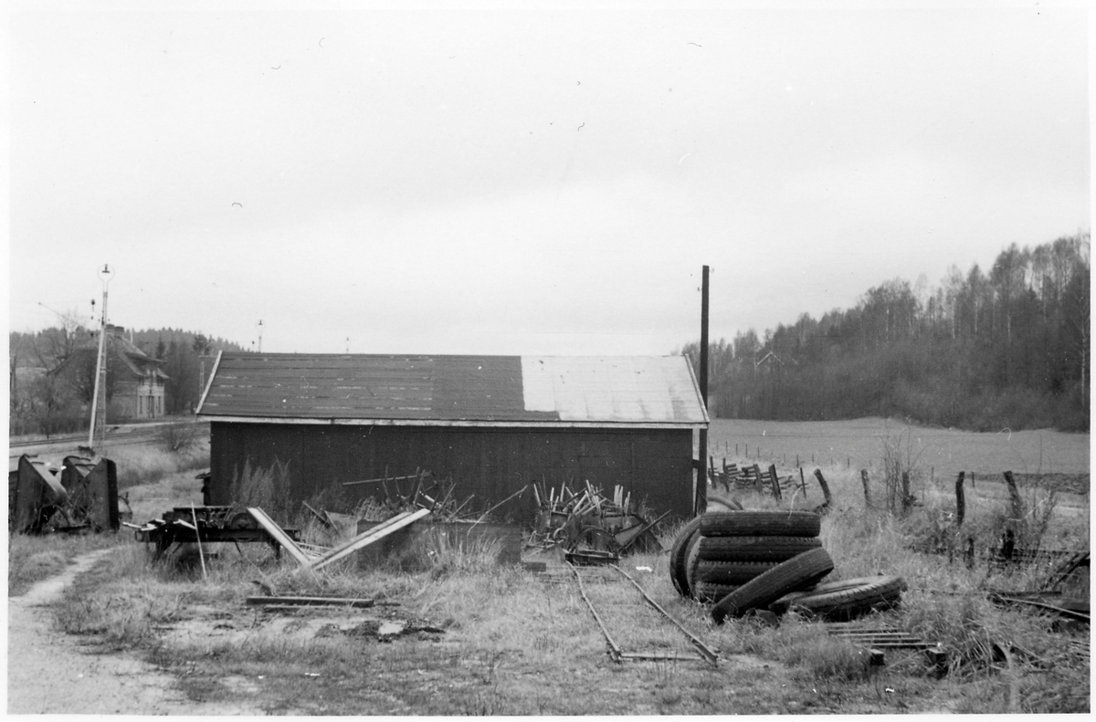 Vägstation O5, Hogstorp, Byggnadsförrådet. Förrådsbyggnad med diverse materielupplag, "skrot". Decauvillevagnar till vänster om förrådet. Skottkärror mot förrådsväggen. Invid elektrifierad järnväg. Hogstorps järnvägsstation i bakgrunden.