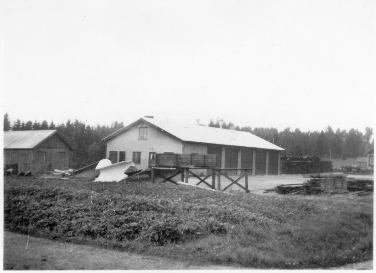 Vägstation O6, Hedekas. Garagebyggnad. Vid gaveln vitmålad spetsplog, sidoplog. Upplag av virke på garageplan.