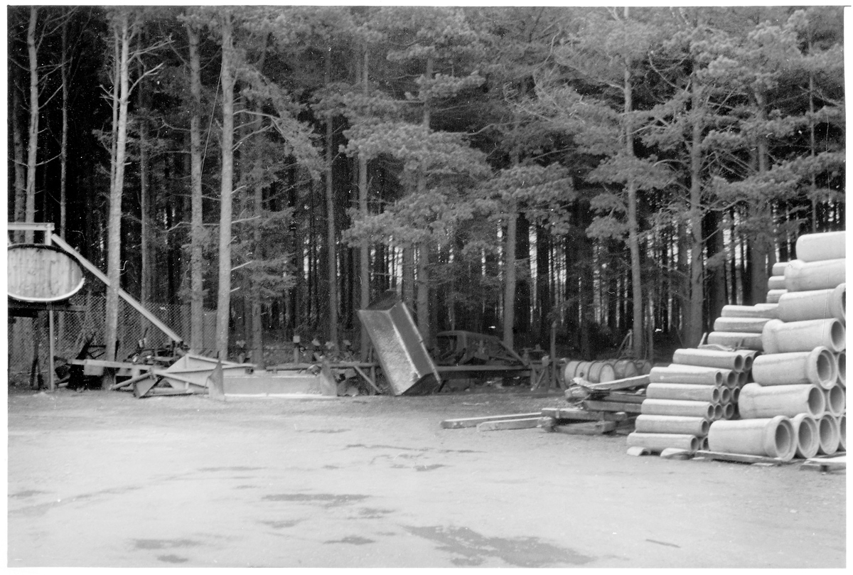 Vägstation P13, Brålanda. Garageplan med diverse material, bland annat luttunna, cementrör, muffrör.