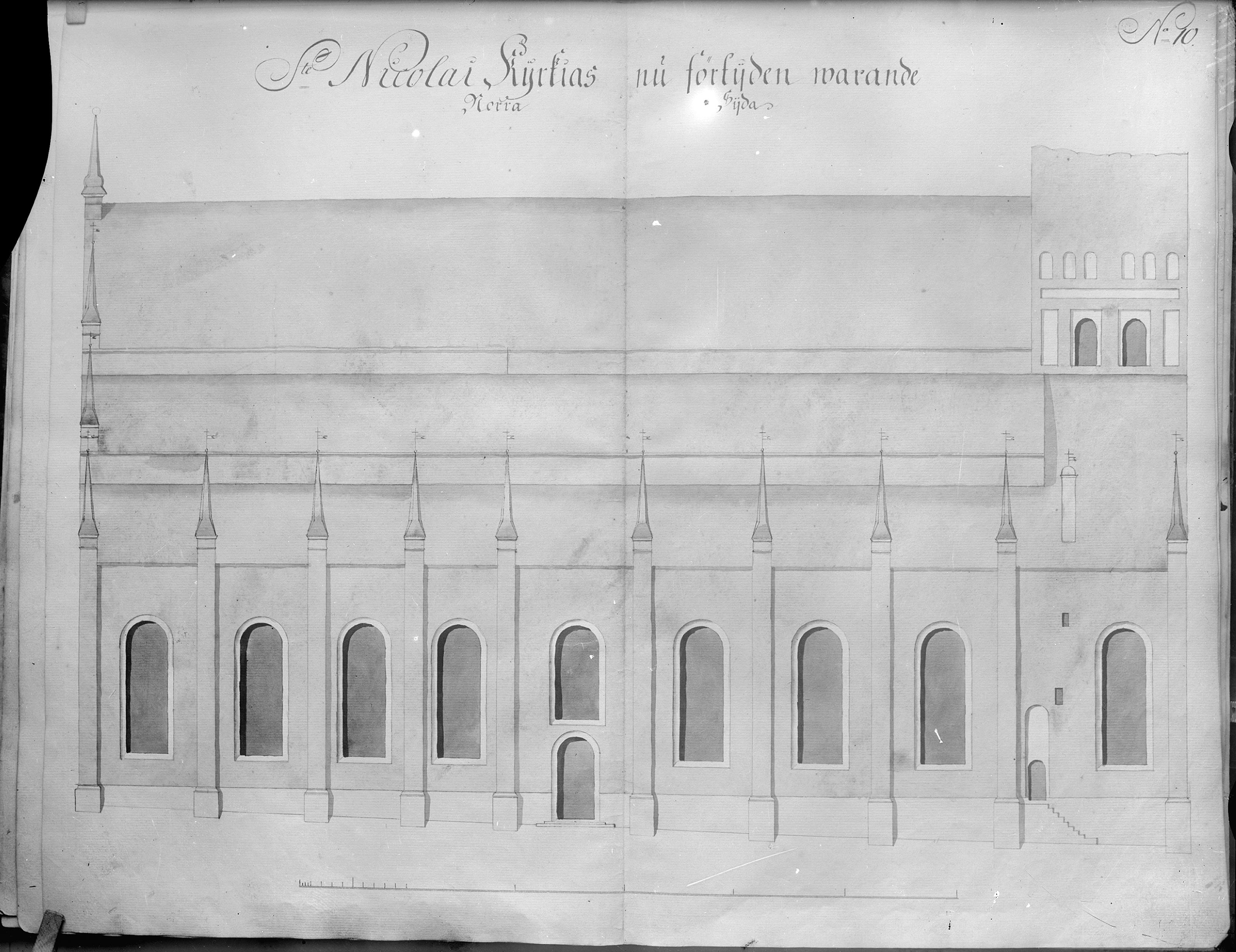 Uppmätningsritning, norra fasaden, foto efter ritning av J. E. Carlberg.