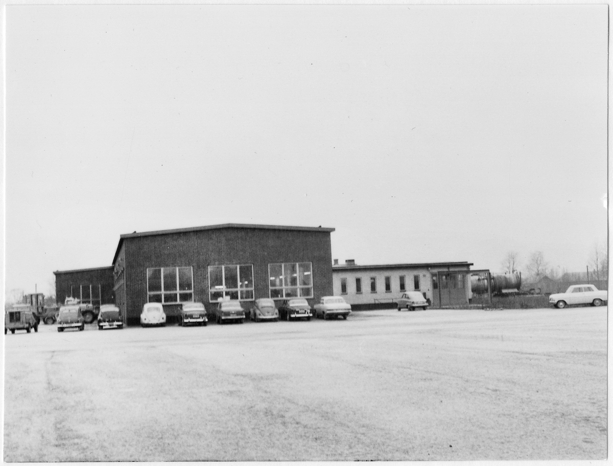Vägstation S9 Kil. Verkstadsbyggnad och garagebyggnad. Personbilar parkerade vid gaveln av verkstadsbyggnaden. Väghyvel och lastmaskin till vänster framför byggnaderna. Eventuellt Vägförvaltningen i Värmlands läns, VFS:s, depåverkstad.