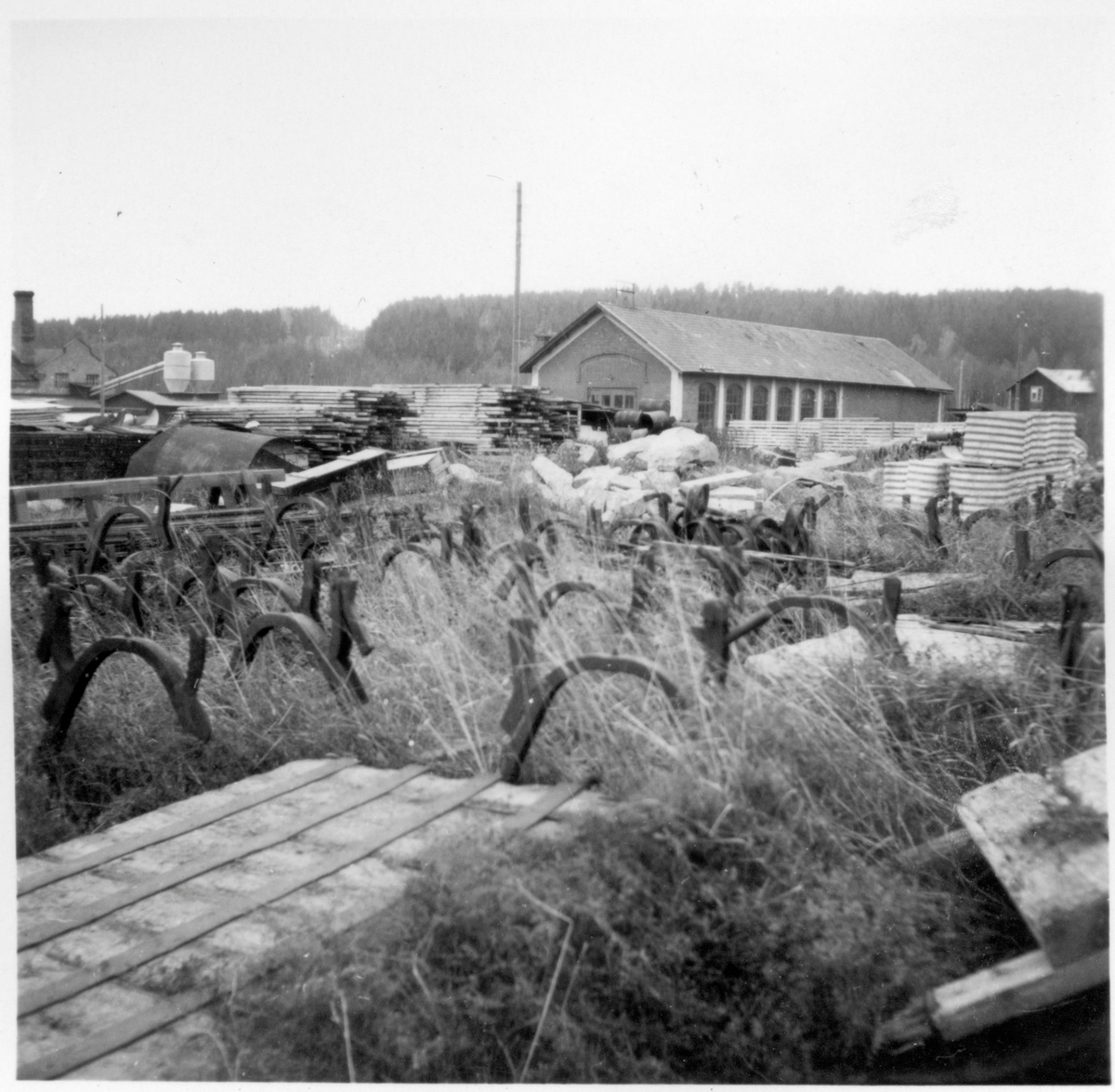 Vägstation Vmo X4, Bollnäs. Skrotupplag. I bakgrunden tegelbyggnad som tillhörde Vägförvaltningen i Gävleborgs län, Depåförrådet.