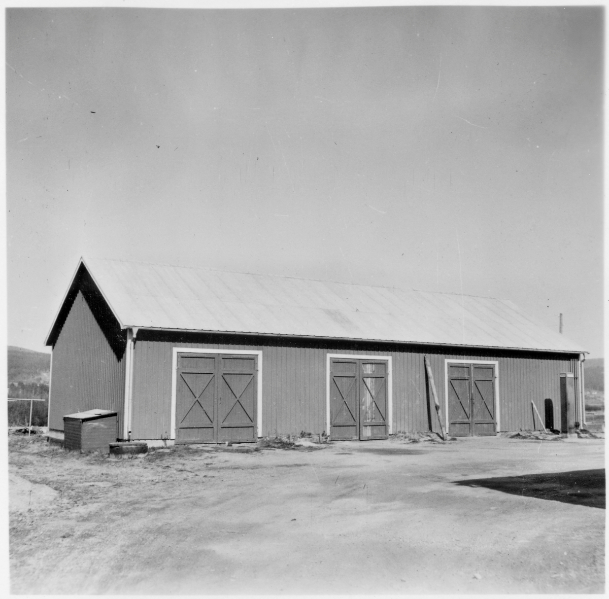 Vägstation Y2, Torpshammar, filial Stöde. Förrådsbyggnad. Redskapslåda vid gaveln. Vi bortre gaveln bensinpump (drivmedelspump).