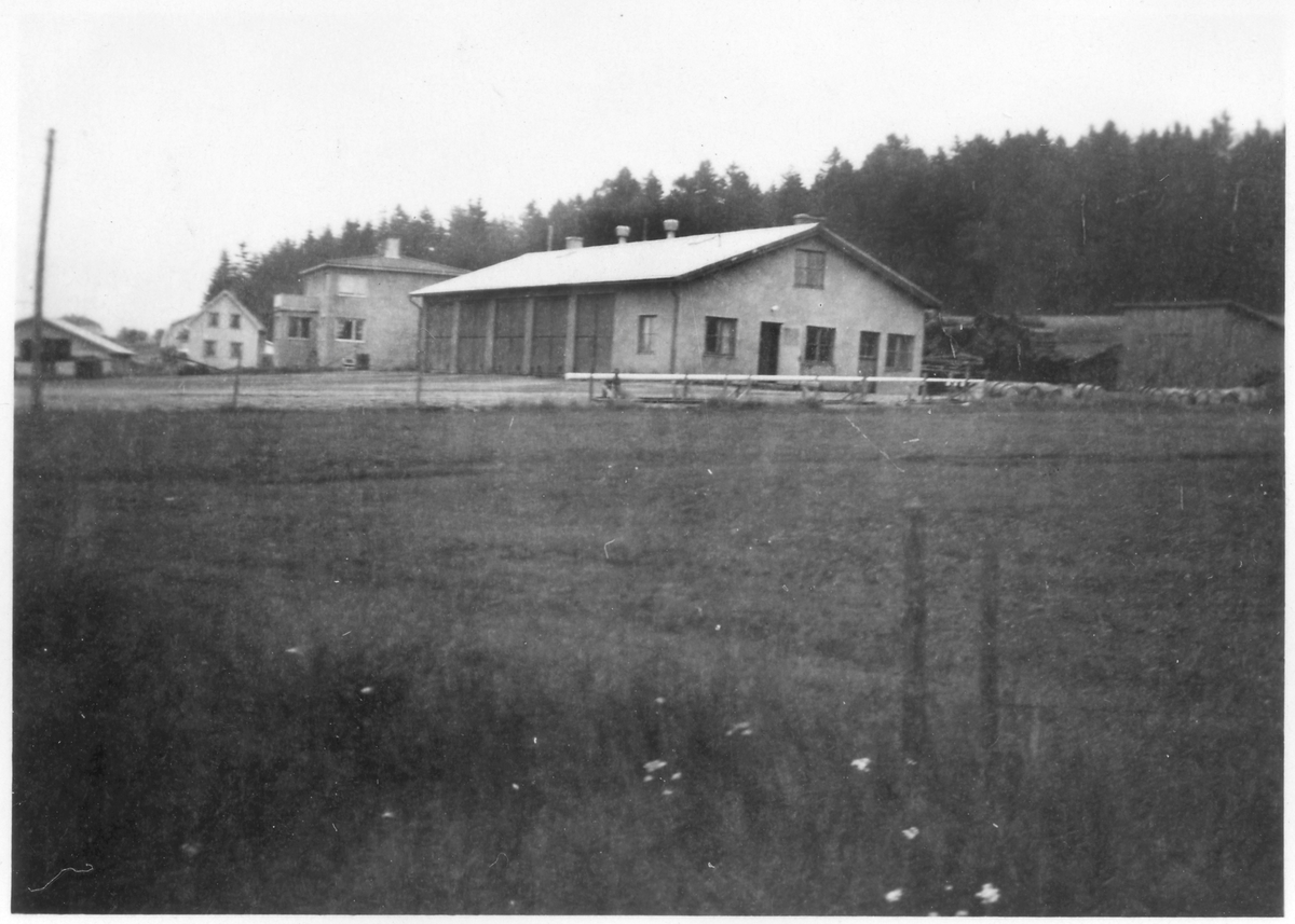 Vägstation O6, Naverstad. Garagebyggnad. I bakgrunden bostadshus.