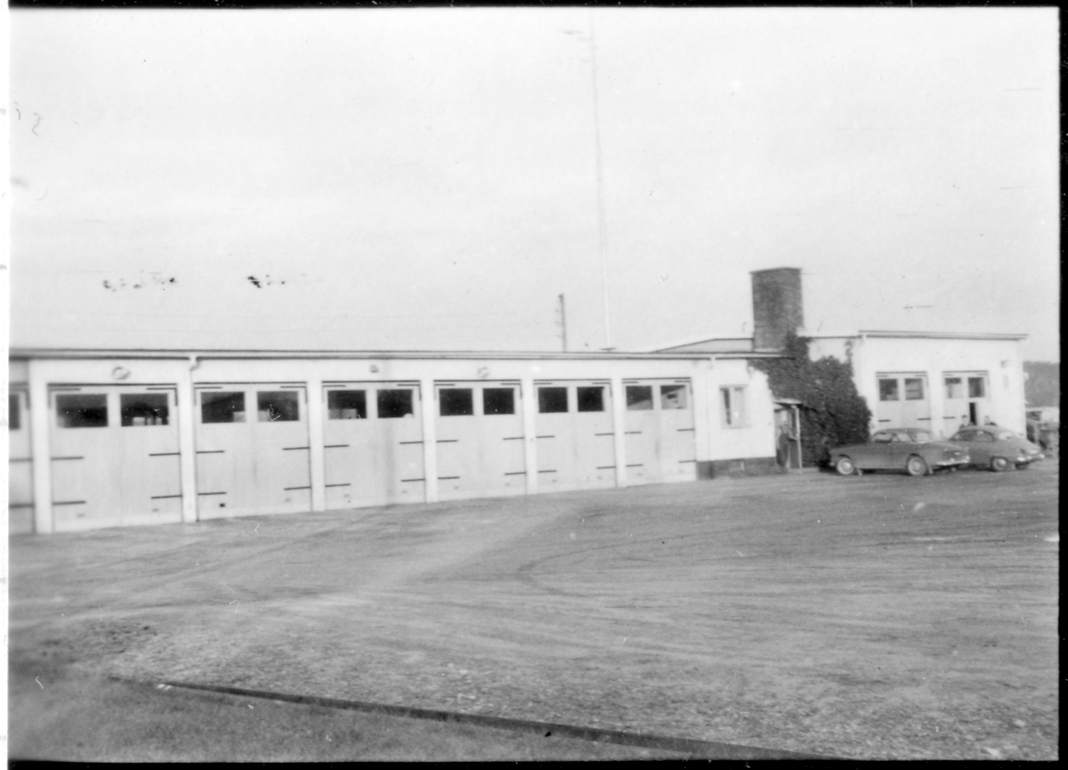 Vägstation P1, Hid. Vägstationens huvudbyggnad med garage, kontor och verkstad. Framför byggnaden personbil Volvo Amazon och Saab.