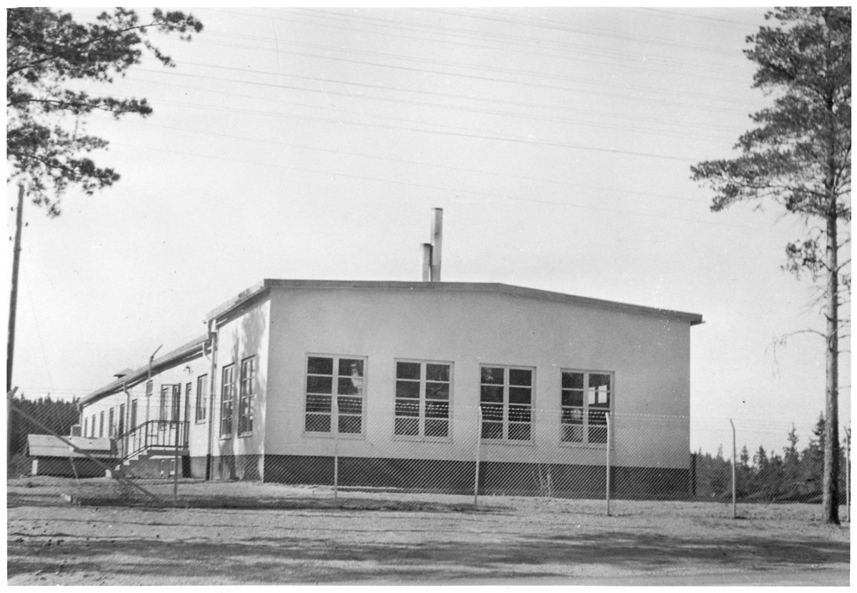 Vägstation S1, Kristinehamn. Vägstationens huvudbyggnad (baksidan) med verkstadsdelen närmast. Trappa till kontorsdelen. Innanför nätstängsel.